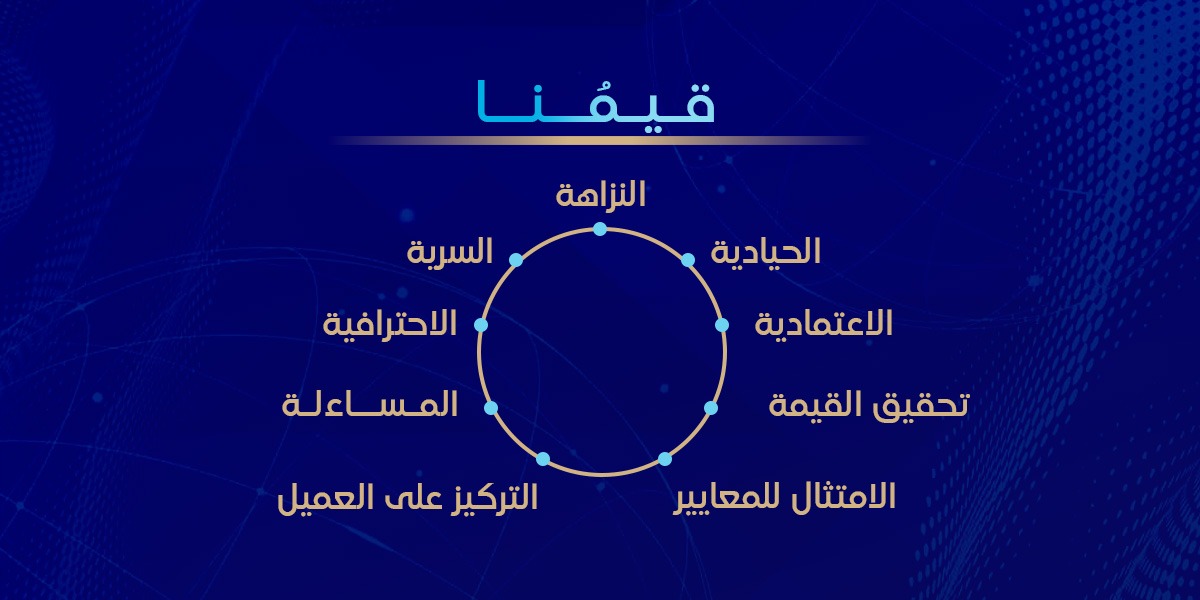 قيمنا تشكل جزءًا لا يتجزأ من هويتنا، وهي التي توجه أسلوب عملنا وتعاملنا مع العملاء والشركاء وكل من نتواصل معهم.